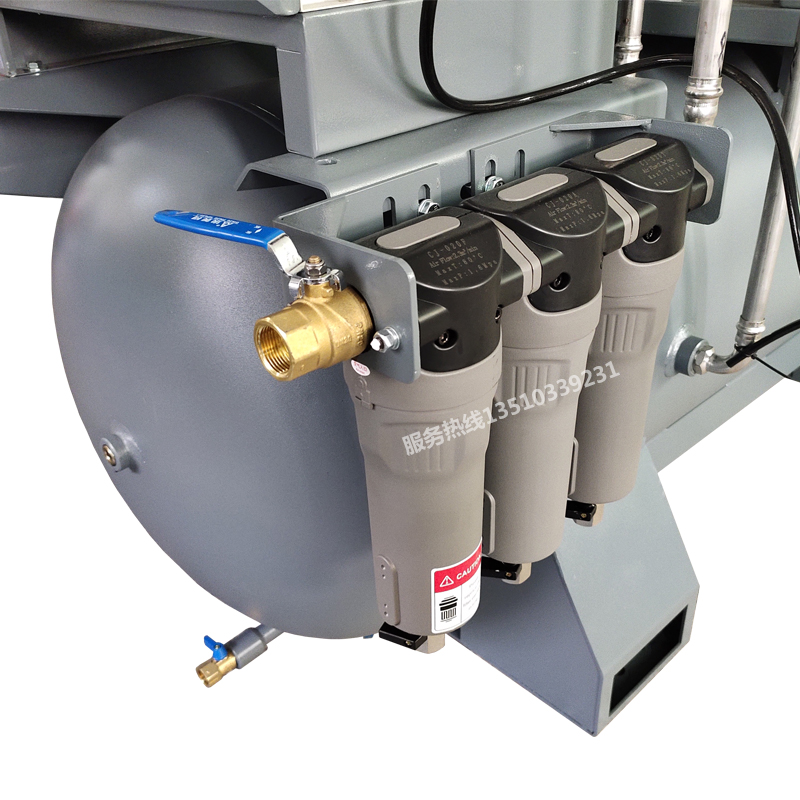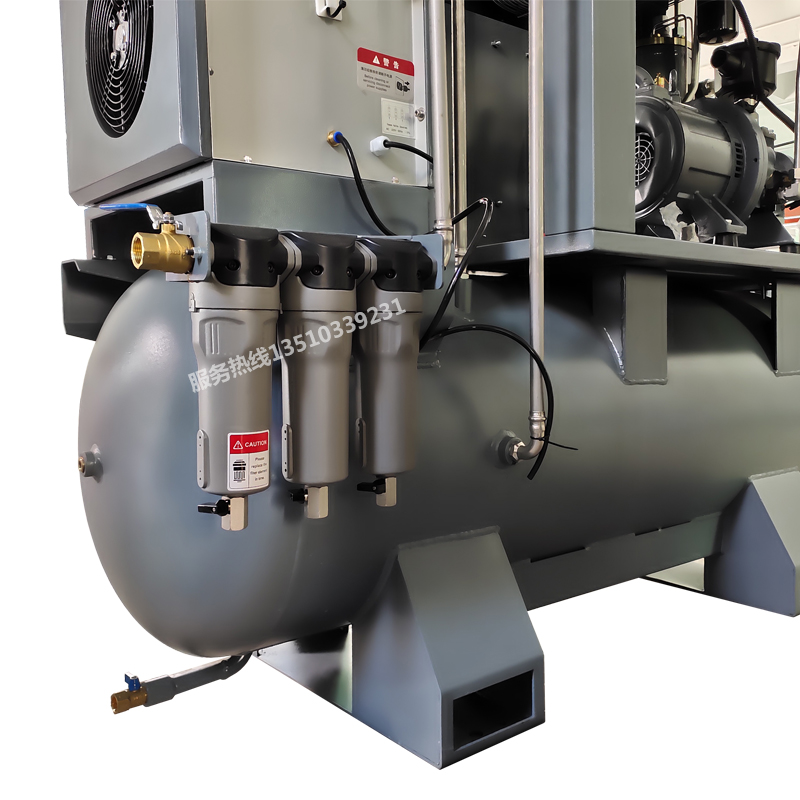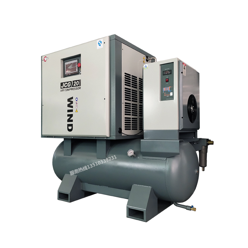 Screw air compressor, refrigerated dryer, filter and air storage tank in one,