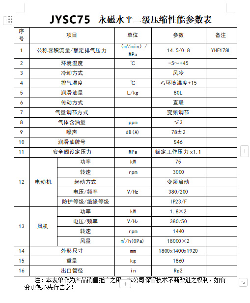產品名稱:75kW 水平雙級直連永磁變頻空壓機 JYSC75
